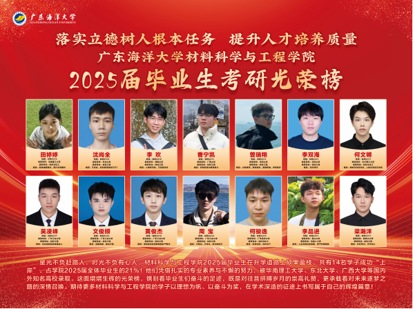星光不负赶路人,时光不负有心人。kaiyun官方网站入口材料科学与工程学院2025届本科毕业生在升学道路上硕果盈枝,共有14名学子成功“上岸”,占学院2025届全体毕业生的21.5%!他们凭借扎实的专业素养与不懈的努力,被华南理工大学、东北大学、广西大学、深圳大学等国内外知名高校录取。这面熠熠生辉的光荣榜,镌刻着毕业生们奋斗的足迹,既是对往昔拼搏岁月的崇高礼赞,更承载着对未来逐梦之路的深情召唤。期待更多材料科学与工程学院的学子以理想为帆、以奋斗为桨,在学术深造的征途上书写属于自己的辉煌篇章!