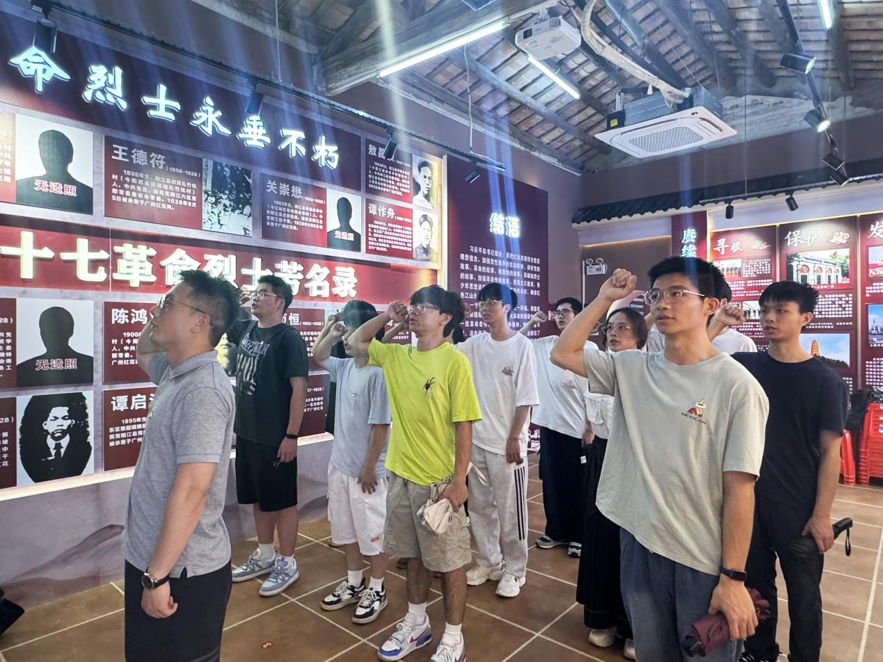 雅韶乡农会是阳江第一个乡农民协会,成为阳江农民运动的先导,是阳江早期革命活动的一面鲜红旗帜。红色文化展览馆五个篇章生动呈现雅韶乡农会成立后,谭作舟等革命先辈带领农民减租减息的英勇事迹。党员同志通过瞻仰革命先辈珍贵遗物与历史照片,学习阳江农民运动史,深刻感悟革命先辈们抛头颅洒热血的英勇无畏精神、坚韧不拔的气概。学生党支部书记林良亨带领全体党员在展馆内举行了重温入党誓词仪式。