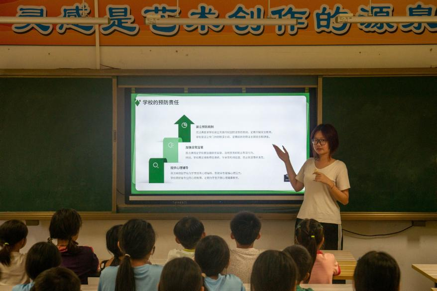 本次宣讲聚焦两个与学生日常生活紧密相关的主题:校园霸凌与交通安全。团队通过通俗易懂的语言,讲解了校园霸凌的定义、应对方式、求助渠道及相关法律条款,帮助孩子们树立自我保护意识,同时结合实际出行情境,普及了安全过马路、骑行规范、交通信号识别等基本知识,解读《中华人民共和国道路交通安全法》中与儿童息息相关的内容。现场气氛热烈,孩子们专注聆听,积极互动,展现出对法治教育的浓厚兴趣。相信此次活动通过互动式教学,在孩子们心中播下了尊重规则、守护自我、关爱他人的法治种子。