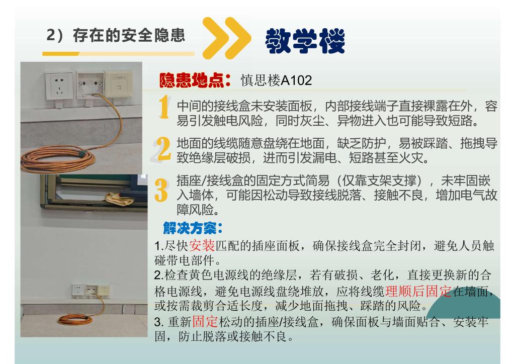 本次活动以“立足生活,守护安全”为主题,号召全校师生用镜头捕捉校园安全隐患,共同守护平安校园。活动自启动以来,得到了众多师生关注与参与,累计收到各类隐患线索百余份。经初步筛选与集体评审,共确定高质量有效提案51份,其中10份兼具创新性与可操作性的提案获评“十佳提案”。同学们通过图文并茂的方式,直观展现了隐患情况并给出切实可行的整改建议,相关线索与提案内容主要涉及宿舍用电安全、食品卫生保障、教学设施维护等多个领域,部分还聚焦台风后未整改到位的安全隐患区域,充分彰显了广海学子心系校园安全的责任与担当。