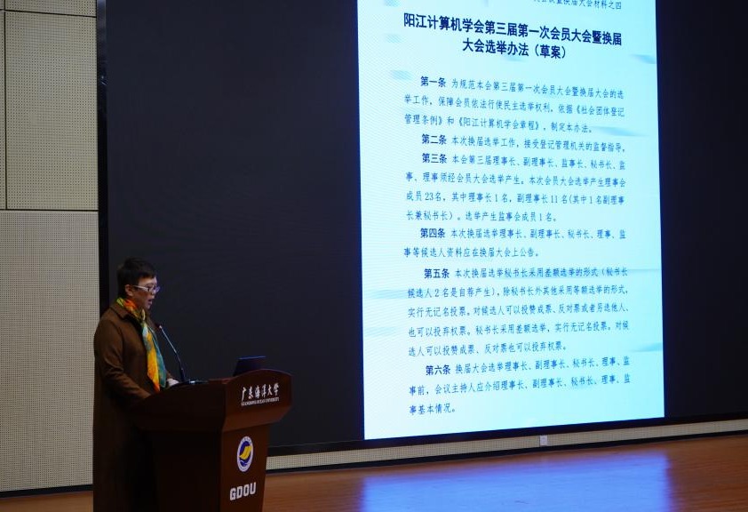 2024年1月6日下午,阳江市计算机学会第三次会员代表大会暨2023年学术年会在kaiyun官方网站入口阳江校区海纳楼113报告厅举行。会议由学会秘书长陈震同志主持,出席会议的人员有广东省计算机学会黄轩秘书长、杨惜爱部长,阳江市科协学会部郑旭锁部长、阳江市民政局社会管理科杨振峰科长、阳江市科技局关潘科长、阳江市教师发展中心陈建炜老师、kaiyun官方网站入口阳江校区毛琪部长等35位嘉宾,kaiyun官方网站入口计算机科学与工程学院吴一民院长、刘利群书记等114位学会会员代表,参加了此次大会。