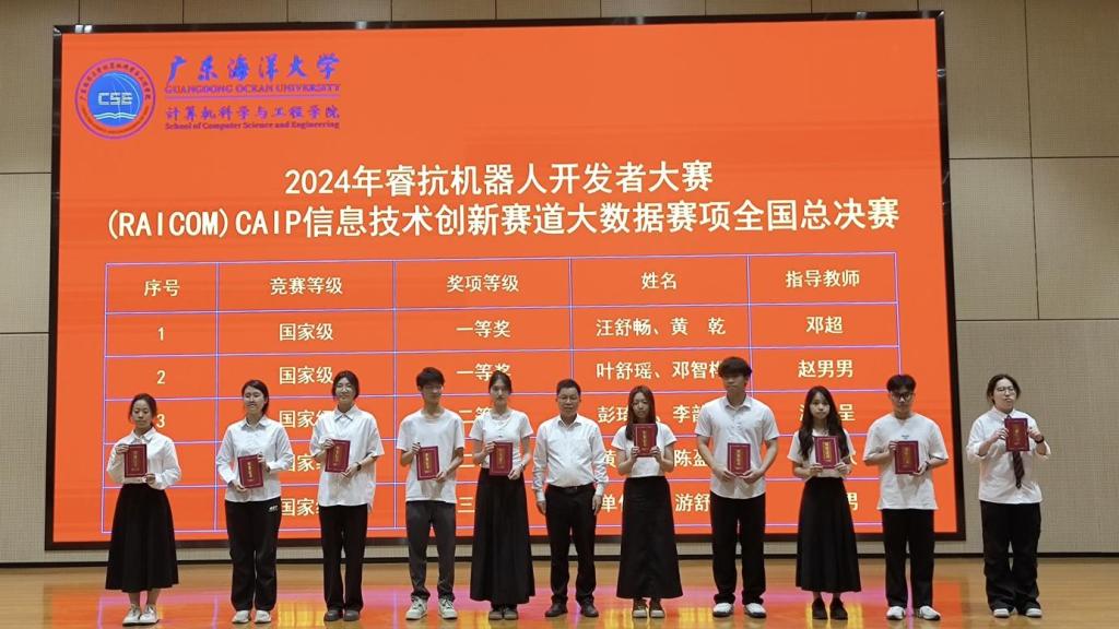 在激昂的乐声和热烈的掌声中,校区、学院领导为获奖学生颁奖。颁奖赛事及奖项有:2024 年睿抗机器人开发者大赛 (RAICOM) CAIP 信息技术创新赛道大数据赛项、2024 年(第 17 届)中国大学生计算机设计大赛全国总决赛、第十九届全国大学生智能汽车竞赛、第十届全国青年科普创新实验暨作品大赛全国总决赛、大学生英语竞赛全国总决赛、全国商务英语竞赛、 MathorCup 高校数学建模挑战赛——大数据竞赛、“高教社杯” 全国大学生数学建模竞赛等国家级奖项。此外,启动仪式还设置了师生宣誓环节,偌大的会议厅里,老师们与学生们的誓言铿锵入耳,振奋人心。