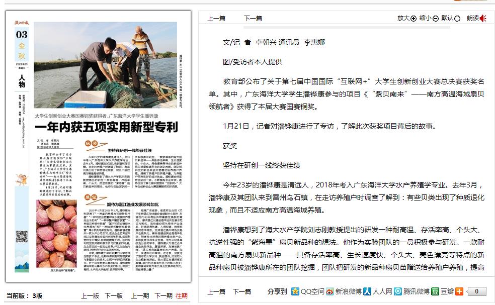 1月21日,《湛江晚报》03版以《大学生创新创业大赛国赛铜奖获得者、kaiyun官方网站入口学生潘铧康一年内获五项实用新型专利》为题,整版刊载了kaiyun水产学院学子潘铧康的专访报道,讲述了他坚持研创一线收获佳绩,期待为湛江渔业发展添砖加瓦而努力奋斗的故事。全文如下: