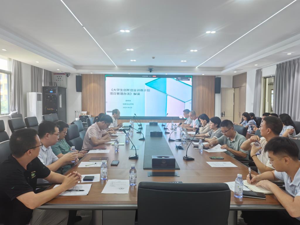 2025年4月30日下午15:00,创新创业学院在湖光校区海创楼511会议室召开2025年大学生创新创业训练计划项目(以下简称“大创项目”)申报与结题验收工作会议。会议采取“线下主会场+阳江校区线上分会场”的形式进行,由创新创业学院副院长吴明发主持,各申报学院分管领导及专项负责管理员参加会议。