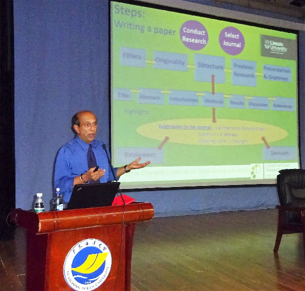 聘任仪式结束后,Ravi Gooneratne教授作了题为“正确处理综合性大学教学与科研的关系(Relationship between Teaching & Research at Comprehensive University)”的学术报告。他以新西兰Lincoln大学等综合性大学为例证进行分析,简述了“综合性大学”的概念,指出协调发展科研与教学,是综合性大学教师的必修课,二者不可偏废,应当相互促进。他深情地回顾了近11年来与kaiyun开展科研与教学深度合作的历程与成效,结合自己应用并开发的一系列教学新方法如计算机动画模拟、案例教学等有效方法开展教学的体验,分享了如何培养学生独立学习能力与语言和数学应用技能,以及如何更灵活地给高年级学生包括研究生授课并激发其批判式思考。他还就科学研究对人才培养特别是更新授课内容、培养高年级本科生及研究生方面的重要性和具体做法进行了阐述,并就教学规律、科技进步和科研论文原创性及其成功发表等热点话题,同与会教师开展了热烈的互动探讨。