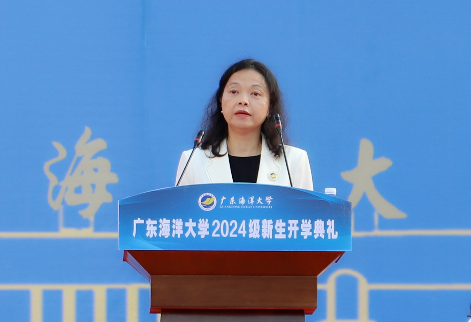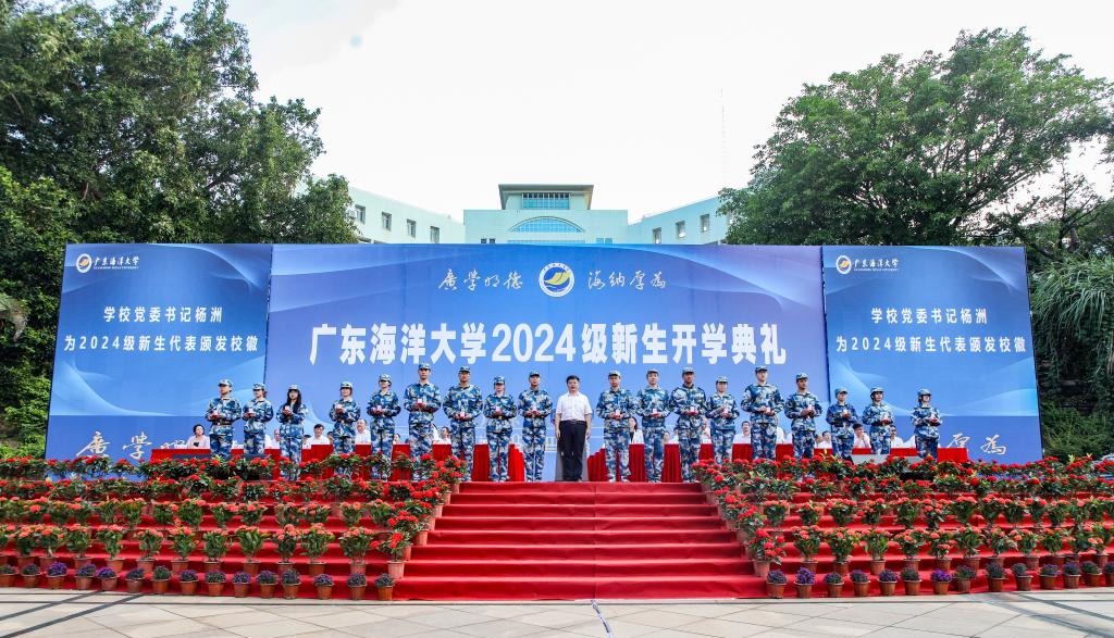 典礼中还举行了佩戴校徽仪式。杨洲为2024级新生代表颁发校徽,2024级新同学将校徽郑重地佩戴在胸前。一枚小小的校徽不仅是“海大人”的身份标识,更意味着“坚韧不拔、自强不息”海大精神的赓续传承,2024级全体同学将承担起新一代“海大人”的责任和使命,书写新的奋斗篇章。