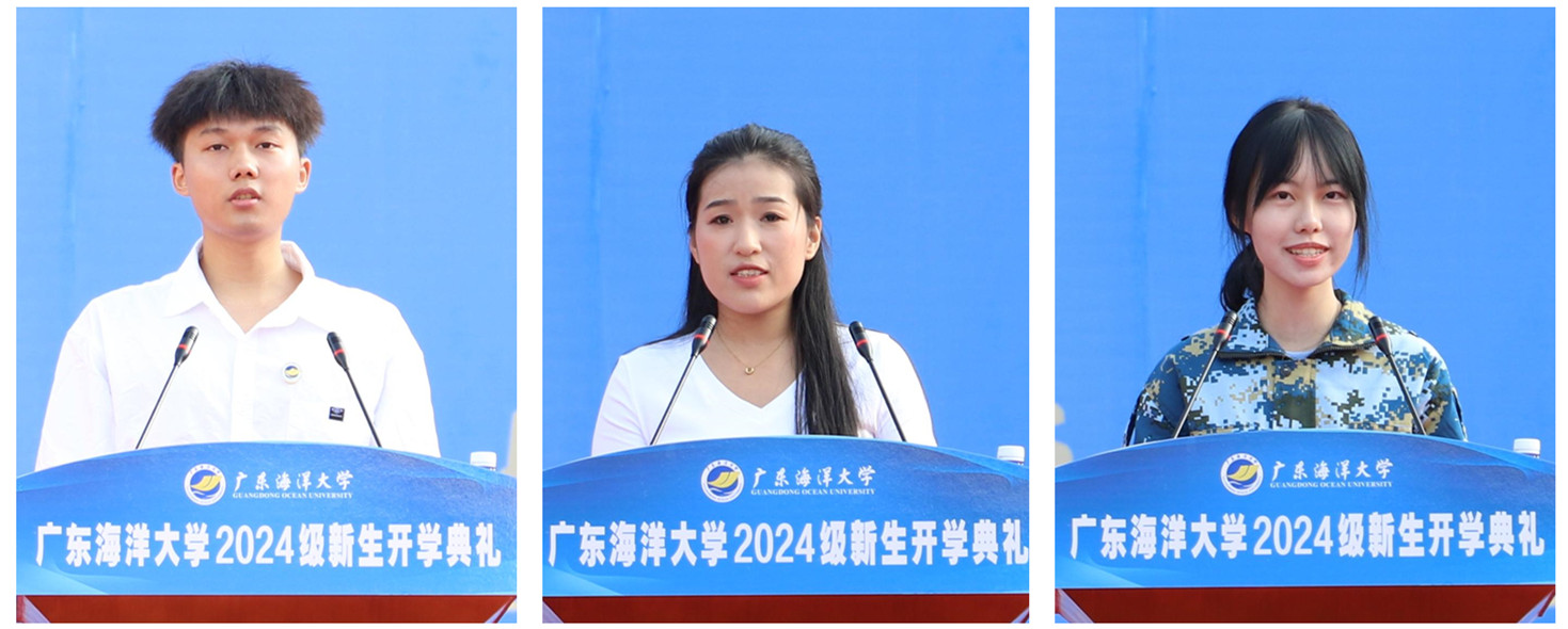 在校生代表(左一)、研究生新生代表(中)、本科生新生代表(右一)发言