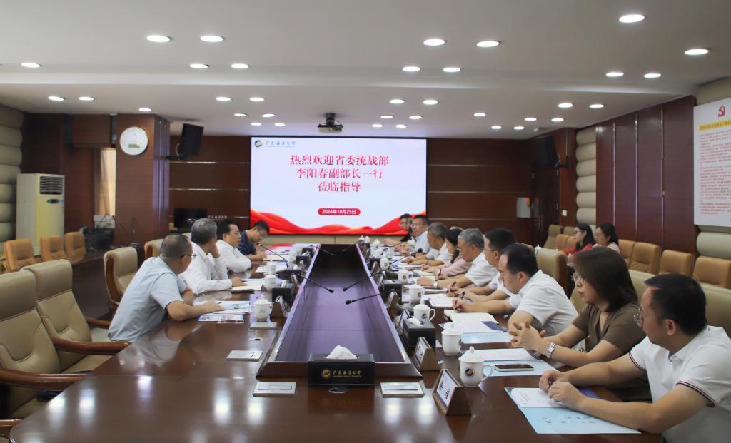 10月25日,省委统战部副部长、一级巡视员李阳春一行来校调研统战工作,湛江市委统战部常务副部长黄昌旺陪同调研。校党委副书记谭平,党委常委、宣传统战部部长林宇,宣传统战部,各民主党派、知联会代表参加会议。
