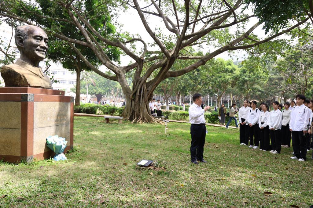 在行政楼前草坪,杨洲与现场听课的同学们问答互动,并以木棉树遭受多次台风侵袭后仍顽强生长的品格,勉励学子传承“坚韧不拔、自强不息”的海大精神。
