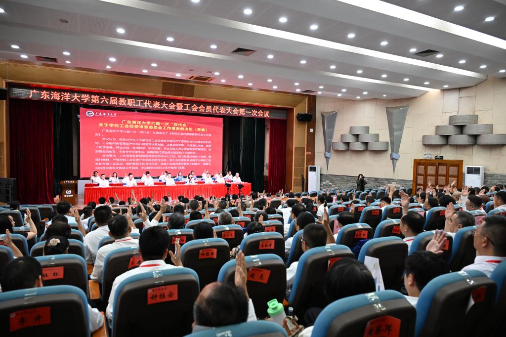 云程发轫,踵事增华。5月8日,学校第六届教职工代表大会暨工会会员代表大会第一次会议(下称六届一次“双代会”)在湖光校区广学楼多功能厅召开。大会主席团执行主席、学校领导杨洲、谭平、谭北平、宁凌、邓逢光、周昌仕、鲁义善、林宇,特邀出席人员胡日章、叶春海、容景春、彭权群、陈泽球、刘东超,以及大会正式代表、列席代表共260余人参加会议,聚焦改革创新和攻坚突围,凝聚智慧和力量推动学校高质量发展。学校党委书记杨洲以《阳光团结 主动实干 奋力谱写“强国建设 海大有为”新篇章》为题作学校工作报告并在闭幕会上讲话。学校党委副书记谭平主持会议并作学校工会工作报告。财务部部长白冰作学校财务工作报告。群团代表、校团委书记袁路致贺词。