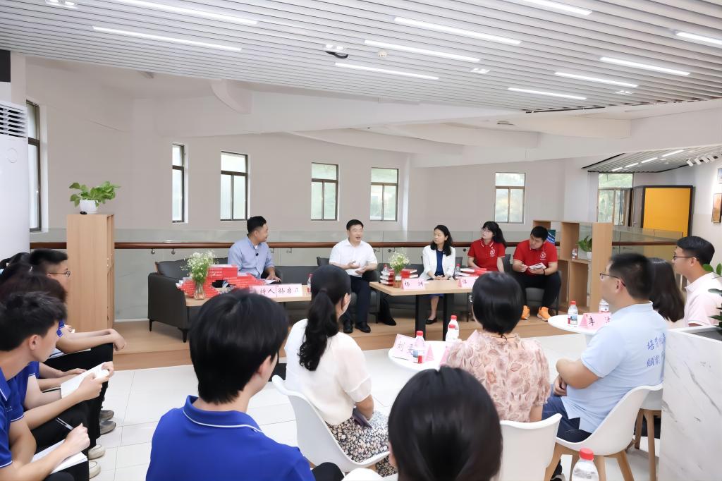 谭平则从女性视角出发,与同学们交流。她结合自身经历对大学生就业给出了中肯建议,鼓励女青年独立自信,不断提升能力,勇于维护自身权益,勇敢追求梦想。青年师生还围绕教师发展、党建融合、教学创新等话题展开热议,共同探讨理想与现实担当。访谈现场其乐融融,欢笑不断。