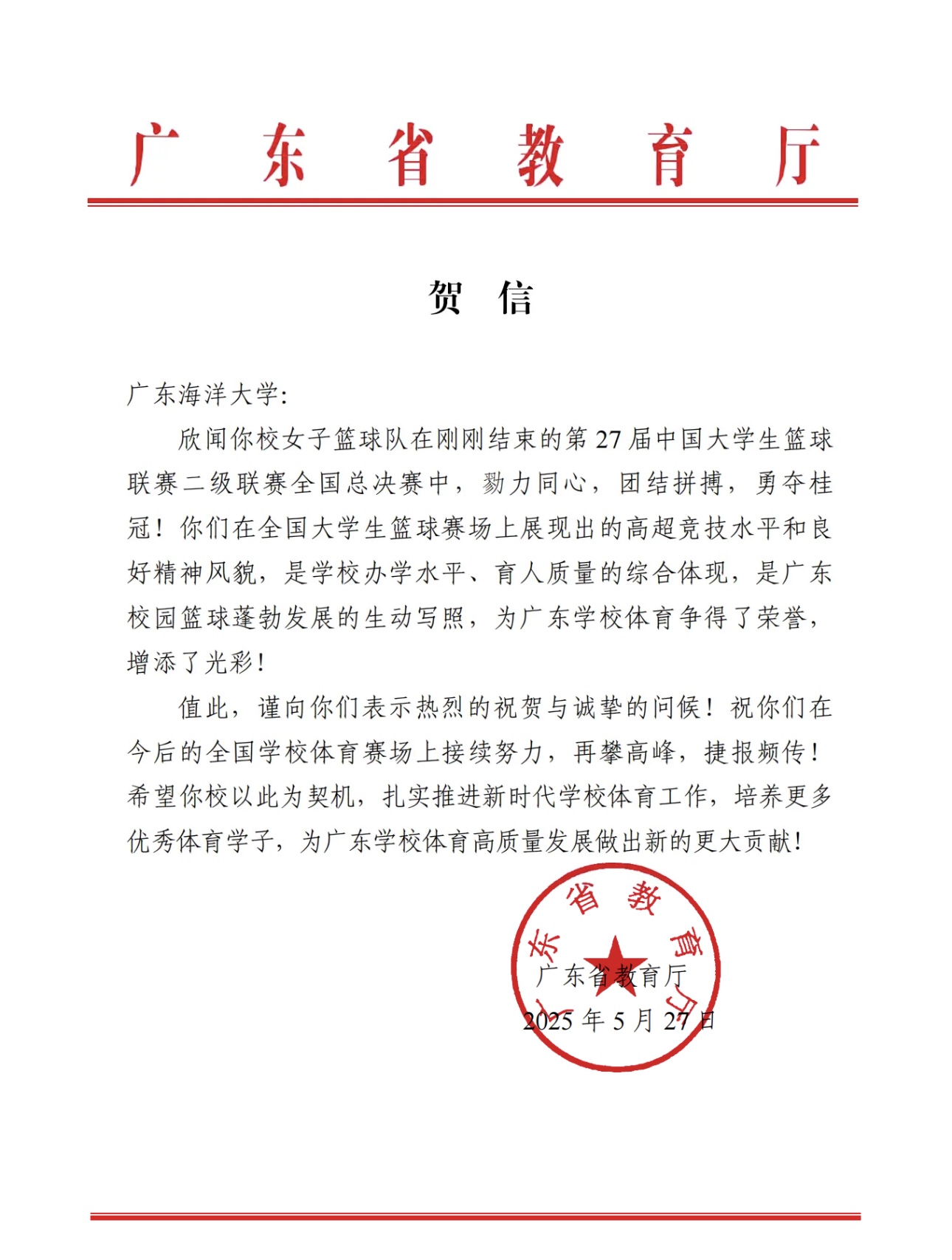5月27日,广东省教育厅向kaiyun致贺信,祝贺学校女子篮球队获得第27届中国大学生篮球联赛二级联赛全国总决赛冠军。