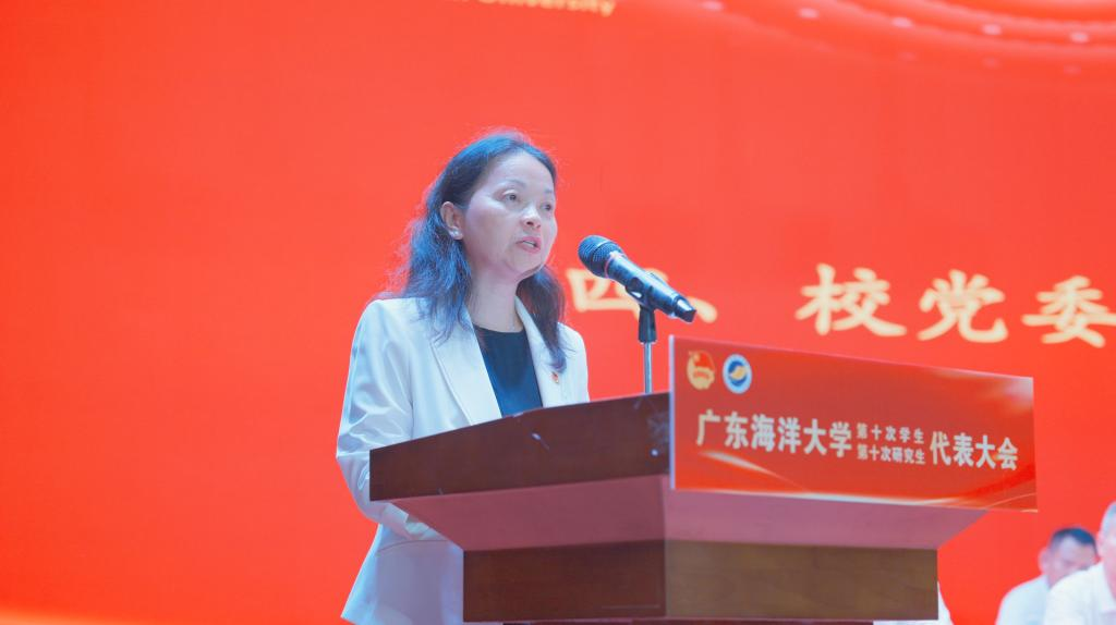 李栩敏代表团湛江市委、湛江市学联致辞,希望海大学生会、研究生会铸就信仰灯塔,锻造可信赖的青春堡垒;锐意革新服务,搭建易触达的青春桥梁;倾心凝聚关爱,构筑能依靠的青春港湾。