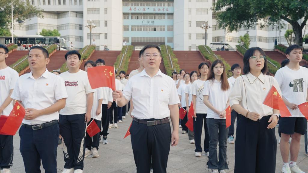 湖光校区升旗仪式在海洋广场举行,阳江校区、海滨校区同步举行升旗仪式。国旗护卫队步伐铿锵,护送五星红旗庄严入场。全场师生齐声奏唱国歌,注视国旗冉冉升起。第十六届国旗护卫队队员何雪莹作题为《国庆节,心中最庄严的信仰》的发言,号召青年学子传承红色基因、砥砺奋斗。仪式在全体齐唱《歌唱祖国》的歌声中结束。