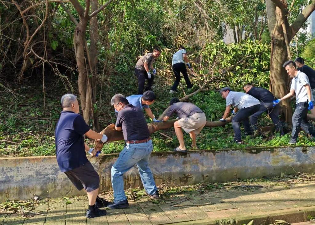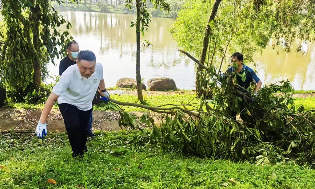 校领导杨洲、邓逢光、鲁义善实地检查了校园各处的灾后重建情况,对树木倒伏严重、积水隐患突出的重点区域进行现场指导,提出了科学高效的清理要求。校领导们还加入到师生队伍中,与大家一同搬运断枝、清扫落叶、清理积水。
