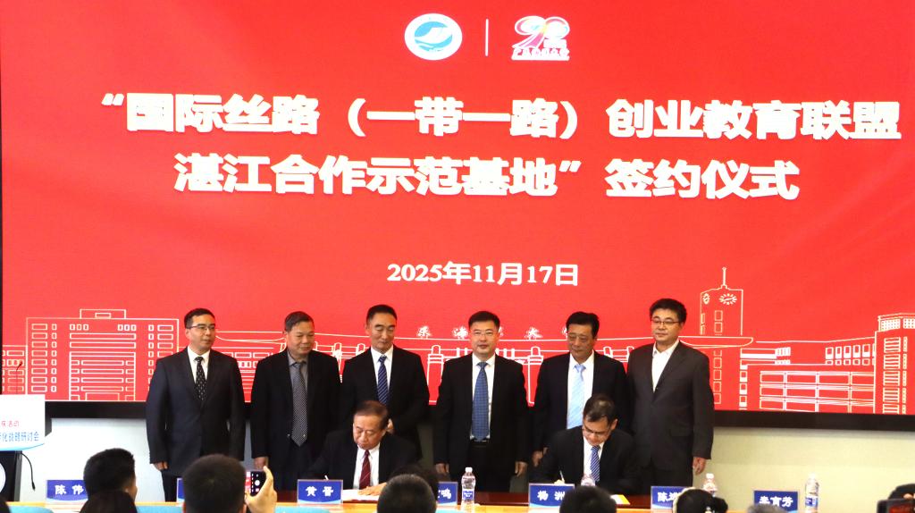 仪式上,杜军与王重鸣签署了国际丝路创业教育联盟湛江基地协议。与会领导为国际丝路创业教育联盟湛江基地揭牌。