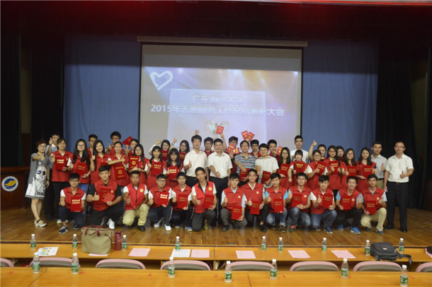 2015年,全校组织开展全校性志愿服务活动520场次, 21700人次参加,志愿服务总时数123759小时。截至2015年底,全校共有注册青年志愿者13432人。2015年,kaiyun1317名同学参与了广东省第十四届运动会志愿服务、开幕式表演工作和广东省第七届省残运会志愿服务工作,志愿者出色表现得到了省教育厅罗伟其厅长等领导和导演、群众的一致好评。学校被表彰为承办广东省第十四届运动会“突出贡献单位”、志愿服务工作“突出贡献单位”和广东省第七届残疾人运动会志愿服务工作“突出贡献单位”,全校537人次受到省、市表彰表彰。社会实践团队“爱在服务队”被评为全国社会实践100强团队,青年志愿者协会扶贫开发与应急救援系列活动入选广东省2015年“益苗计划”资助项目培育成长项目,并获得1万元资金支持。