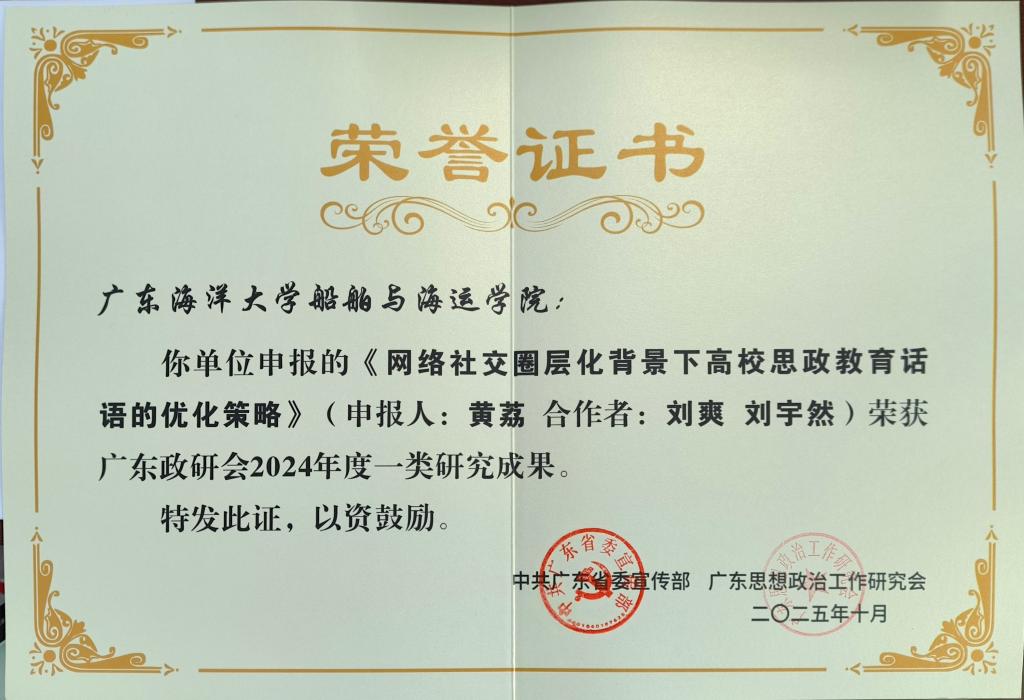 近日,广东省委宣传部、广东思想政治工作研究会联合印发了《广东政研会2024年度优秀研究成果和组织工作优秀单位名单》,kaiyun船舶与海运学院辅导员黄荔、刘爽、刘宇然撰写的学术论文《网络社交圈层化背景下高校思政教育话语的优化策略》荣获一类研究成果。