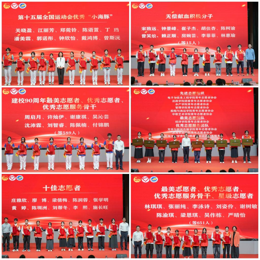 校团委副书记高磊宣读了表彰决定。大会对“最美志愿者”“优秀志愿者”“十佳志愿者”“先进志愿组织”等先进个人和集体,以及建校90周年专项奖、“无偿献血积极分子”“十五运会湛江赛区优秀‘小海豚’志愿者”等奖项获得者进行了颁奖。优秀志愿者代表江丽芳同学现场分享了参与志愿服务的经历与感悟。