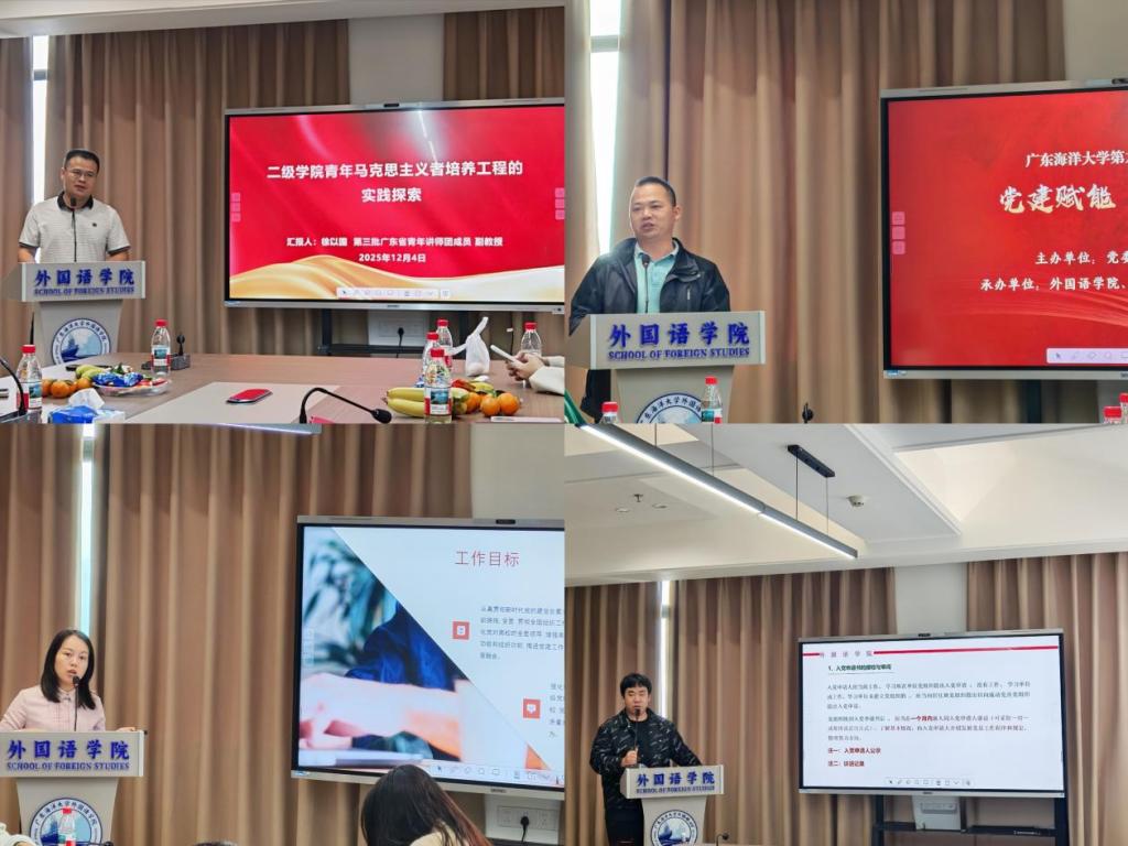文传与新闻传播学院徐以国聚焦院级青马工程,介绍了八期培训班“理论+专业+实践”的培育体系,通过红色研学、结业汇演等活动锤炼学员能力;机械工程学院庞乐为围绕“党建+科创”提出四大突破方向——让价值引领具象化、构建党支部科创实验室育人生态、深耕学科交叉领域、用青年语言塑造党建品牌;外国语学院李洁解读了“双创”与样板党支部建设要点,分享了学生党支部“读讲译”专业融合、党员积分制等特色举措;外国语学院钟翔则系统讲解了基层党组织标准化建设流程,明确了党员发展“三投票五公示一答辩三备案”等核心规范。