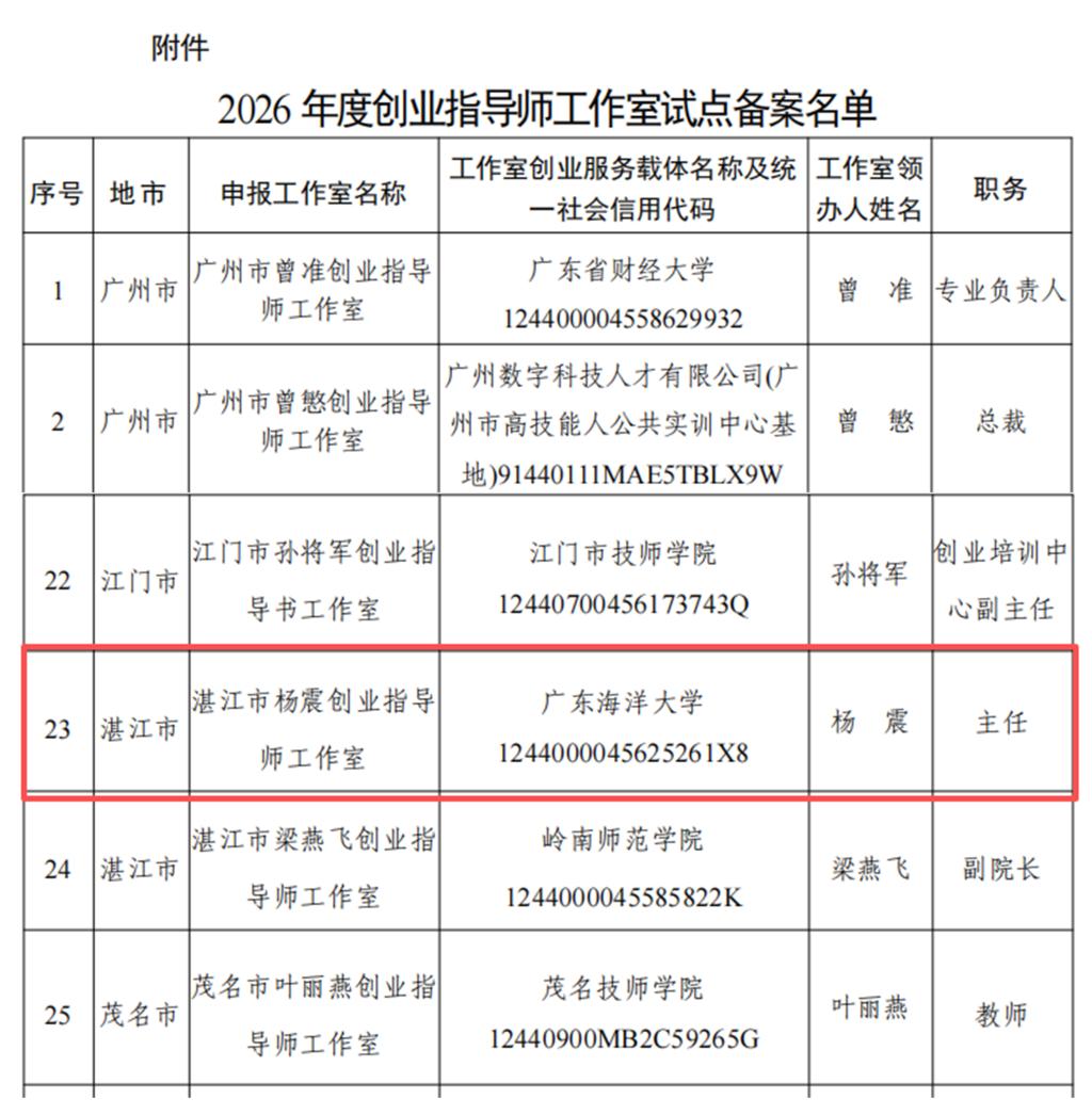 近日,经自主申报、湛江市人力资源和社会保障局审核推荐,以kaiyun创新创业学院办公室主任杨震为领办人的“湛江市杨震创业指导师工作室”通过广东省人力资源和社会保障厅备案,入选全省创业指导师工作室试点建设名单。这是kaiyun在创业指导服务平台建设领域的重大突破,也是首个获省级人社部门试点备案的创业指导类工作室,标志着kaiyun创新创业教育与社会服务能力获得省级主管部门的认可。