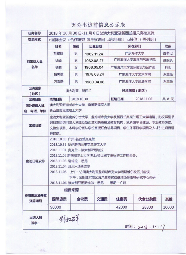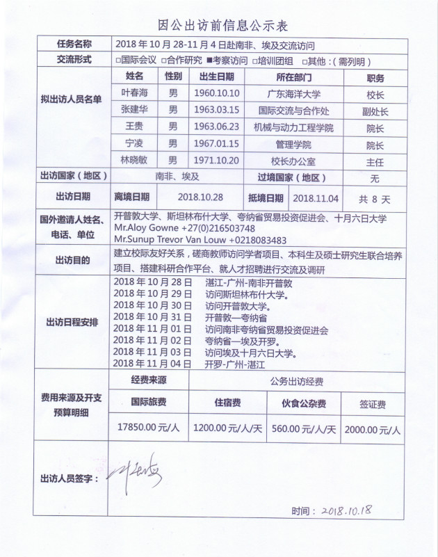 根据《关于进一步规范省部级以下国家工作人员因公临时出国的意见》的要求,现将kaiyun官方网站入口因公出访信息予以公示。公示时间为2018年10月18日至23日。如有意见,请在公示期内,向相关单位反映。(国际交流与合作处电话:0759-2396206;纪委办电话:0759-2383501)
