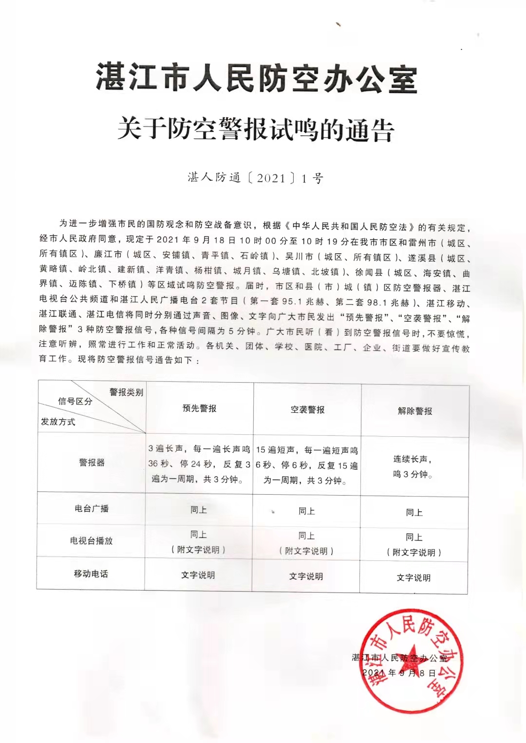 现将湛江市人民防空办公室《关于防空警报试鸣的通告》(湛人防〔2021〕1号)予以转发,请各单位部门做好宣传教育工作,届时请广大师生不要惊慌,保持正常的工作、学习和生活秩序。