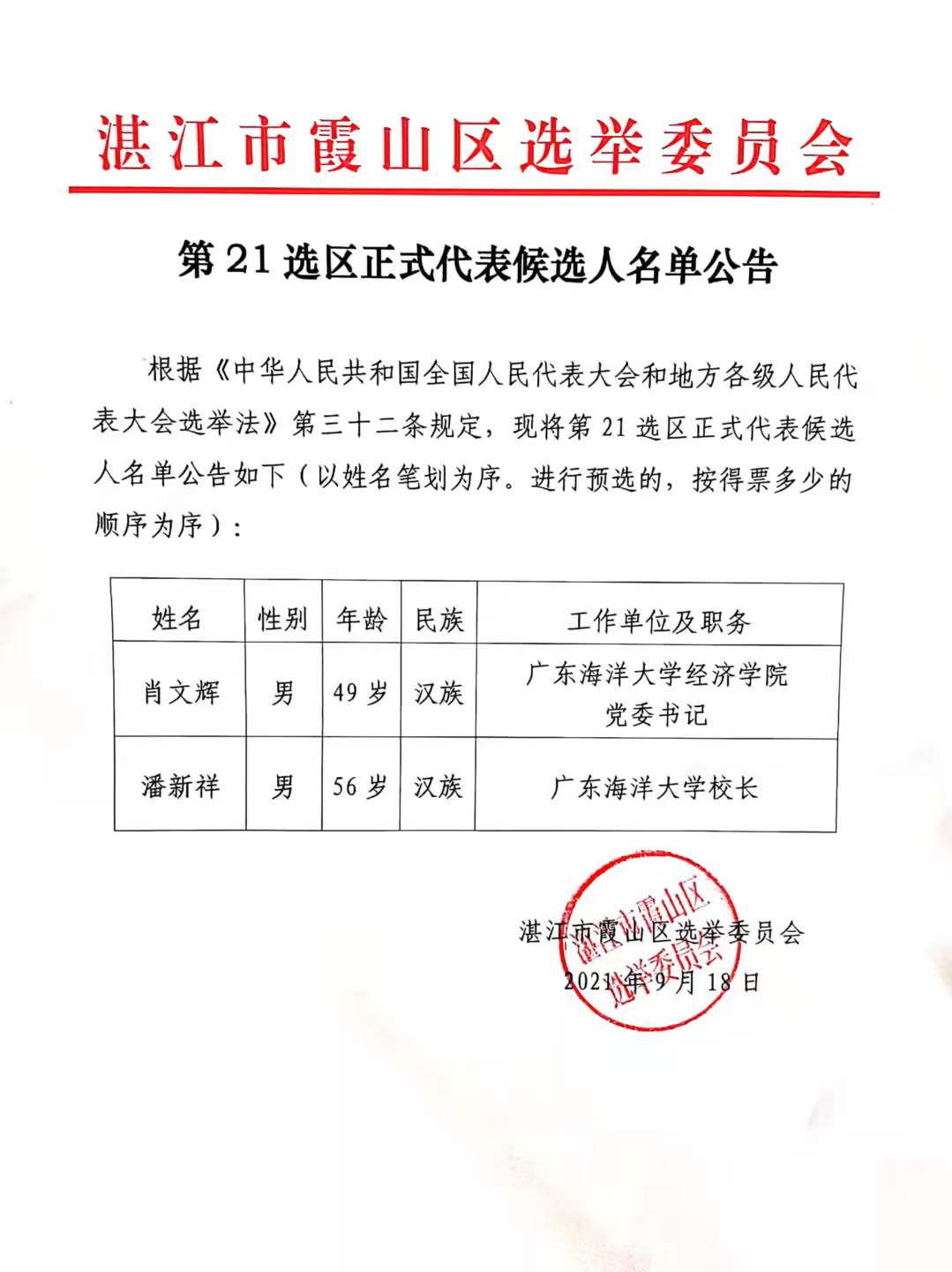 第21选区正式代表候选人名单公告