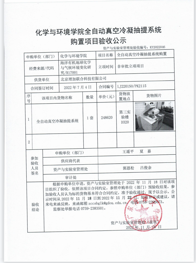 化学与环境学院全自动真空冷凝抽提系统购置项目验收公示