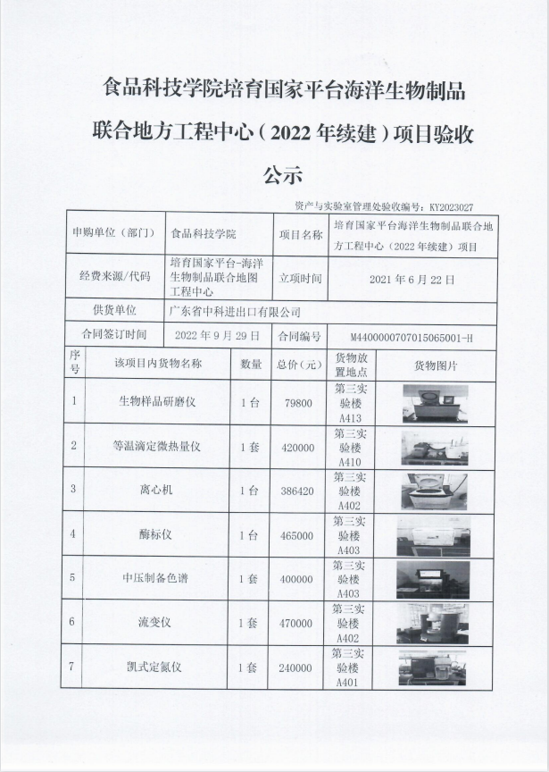 食品科技学院培育国家平台海洋生物制品联合地方工程中心(2022年续建)项目验收公示