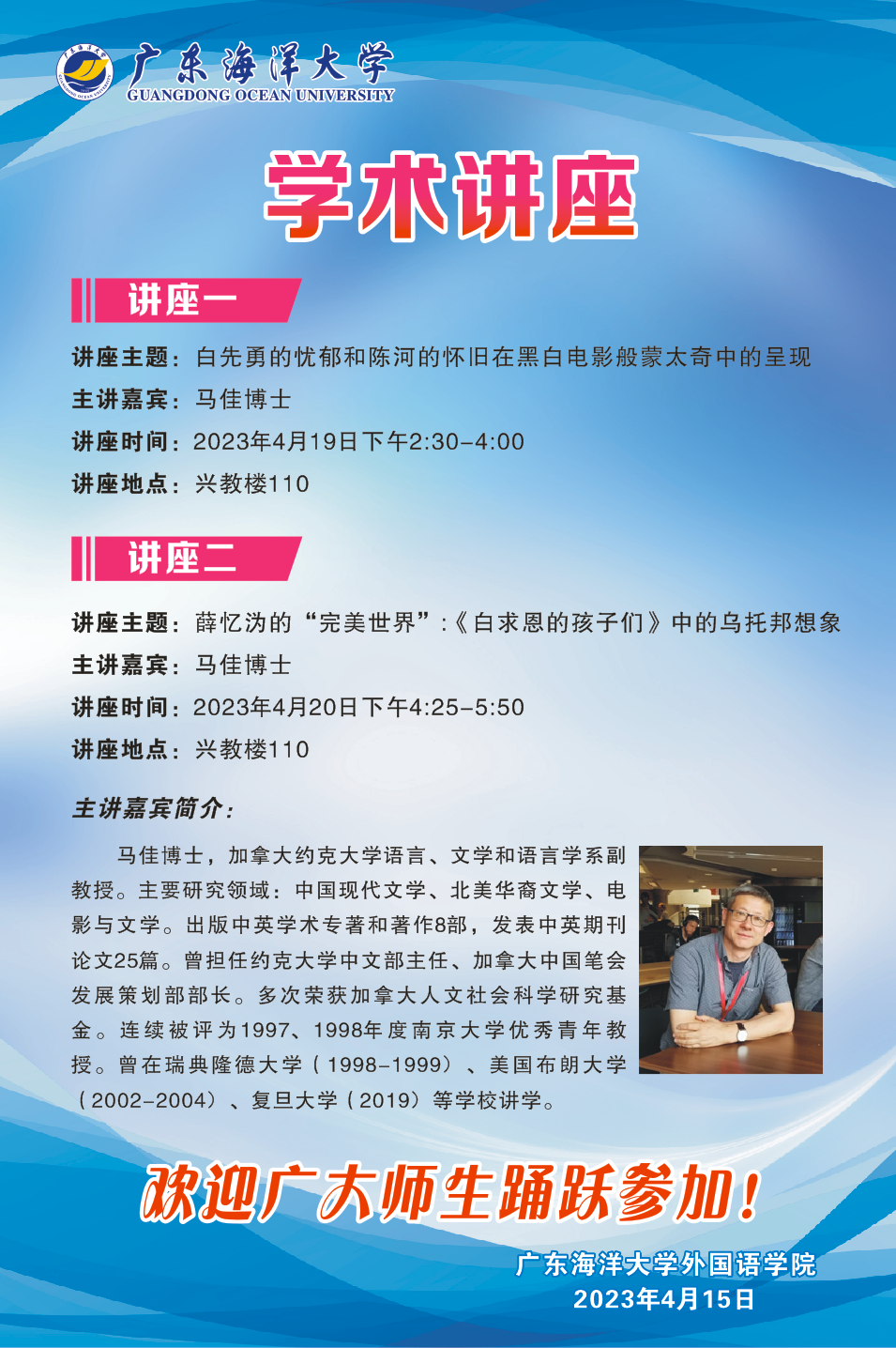 学术讲座:《白先勇的忧郁和陈河的怀旧在黑白电影般蒙太奇中的呈现》、《薛忆沩的“完美世界”:<白求恩的孩子们>中的乌托邦想象》