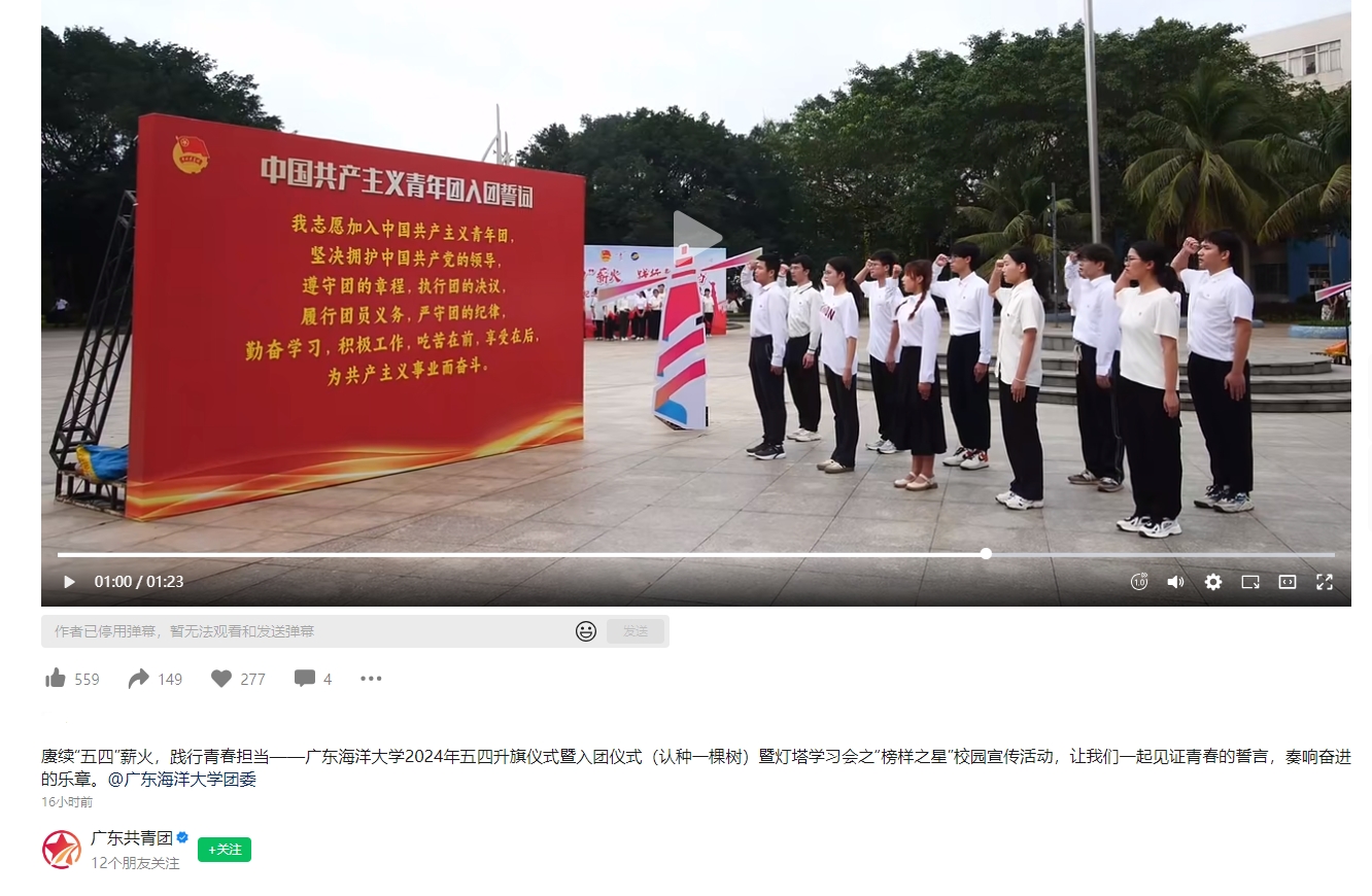 5月6日,广东共青团官方视频号刊播视频,展示了kaiyun2024年五四升旗仪式暨入团仪式(认种一棵树)暨灯塔学习会之“榜样之星”校园宣传活动。