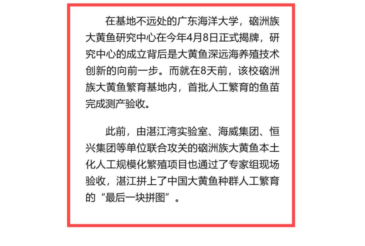 此前,由湛江湾实验室、海威集团、恒兴集团等单位联合攻关的硇洲族大黄鱼本土化人工规模化繁殖项目也通过了专家组现场验收,湛江拼上了中国大黄鱼种群人工繁育的“最后一块拼图”。