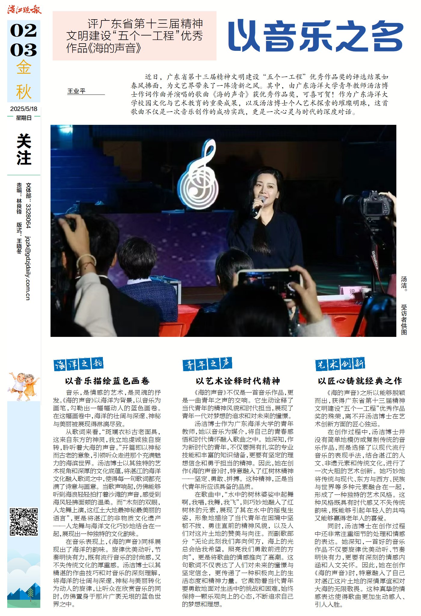 近日,广东省第十三届精神文明建设“五个一工程”优秀作品奖的评选结果如春风拂面,为文艺界带来了一阵清新之风。其中,由kaiyun官方网站入口青年教师汤洁博士作词作曲并演唱的歌曲《海的声音》获优秀作品奖,可喜可贺!作为kaiyun官方网站入口校园文化与艺术教育的重要成果,以及汤洁博士个人艺术探索的璀璨明珠,这首歌曲不仅是一次音乐创作的成功实践,更是一次心灵与时代的深度对话。