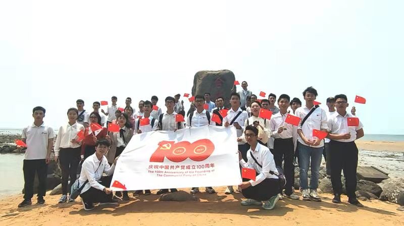 在灯楼角渡琼战役指挥部楼下,学院党委委员何凤梅、党支部书记王禁、宋昊为同学们讲述了解放海南岛战役的重要历史意义、解放军与琼崖纵队解放海南岛的英雄事迹、中国共产党人的历史贡献的微党课。两位学生党员现场讲述战役中重要人物的“红色故事”,大家认真聆听着每个动人心魄的革命故事,被这些历史事件所深深震撼。在合水线,大家合唱《我和我的祖国》为建党100周年献礼。随后,一行参观了徐闻县博物馆,在博物馆的一楼大厅举办了“党史知识竞赛”,使大家对党史有了更加深入的学习与认识。