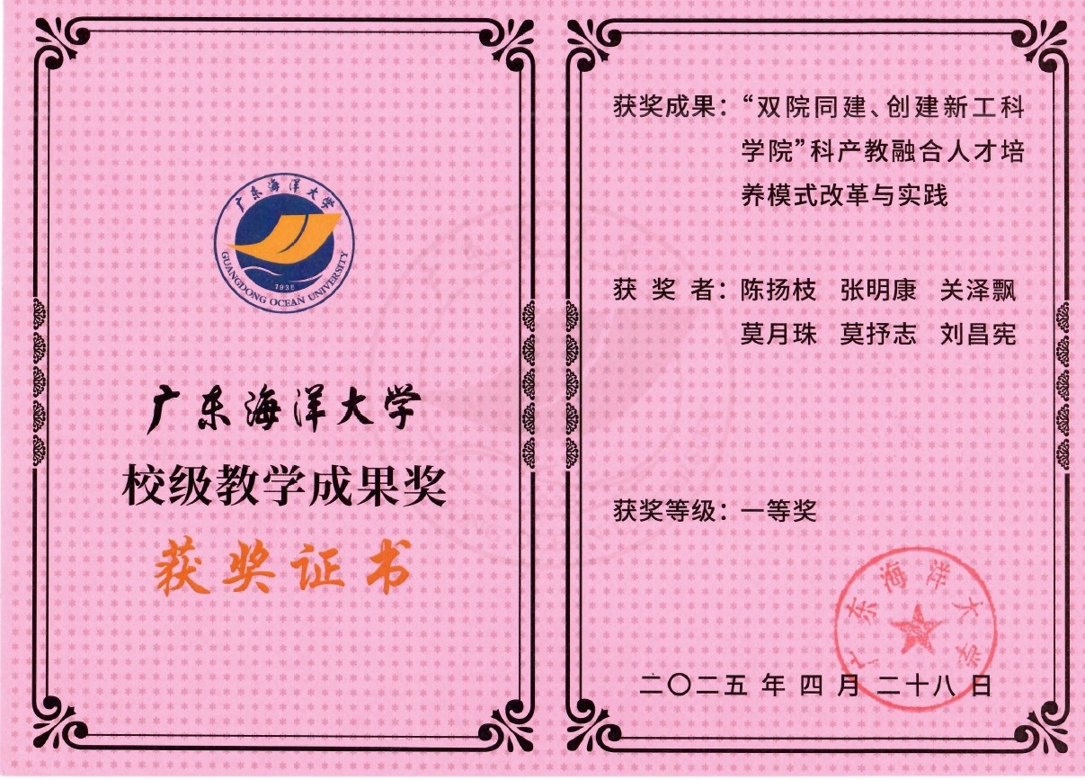 根据《关于开展2024年校级教学成果奖评选工作的通知》(校教务〔2024〕103号),经个人(团队)申报、单位(部门)推荐、职能部门资格审查、专家评审、学校教学指导委员会审议,我院陈扬枝、张明康等人申报的成果——《“双院同建、创建新工科学院”科产教融合人才培养模式改革与实践》获得kaiyun官方网站入口教学成果奖一等奖,该项奖励是学校对我院四年来办学成果的高度认可。