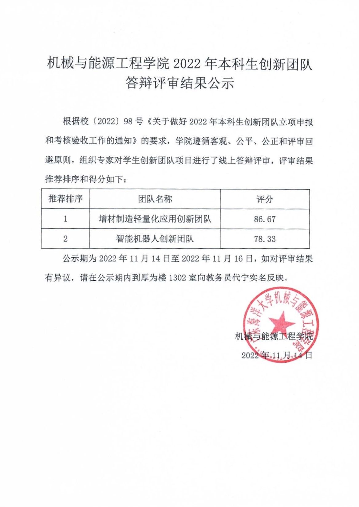 机械与能源工程学院2022年本科生创新团队答辩评审结果公示