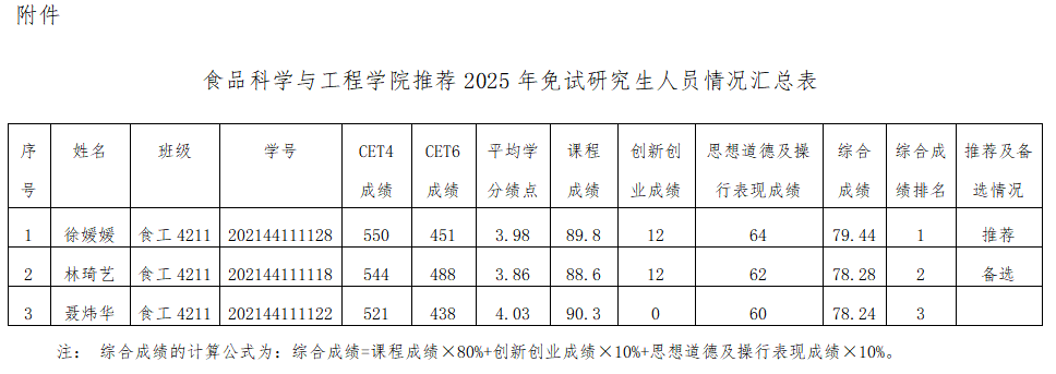附件:食品科学与工程学院推荐2025年免试研究生人员情况汇总表