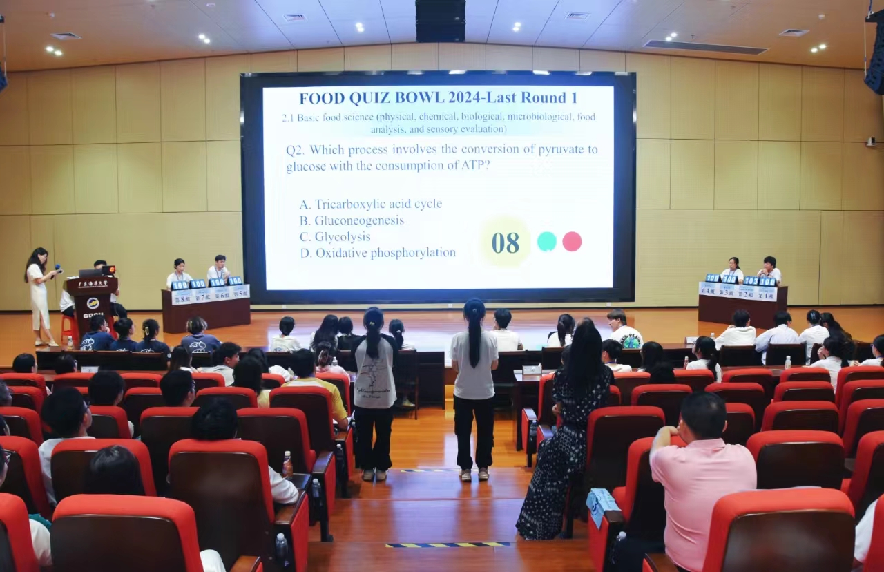 竞赛现场气氛热烈。FOOD QUIZ BOWL是一项快速知识竞答型的竞赛,内容涉及食品科学(物理、化学、生物、微生物、食品分析等)、食品安全(法律法规、GMP、HACCP等)、食品工程(加工、包装、贮藏等)和食品营养四个方面。竞赛分预赛和决赛二个环节,竞赛题目和答题全部为英文,现场采用英文为工作语言。参赛者围绕食品专业相关知识进行全英语快速问答,充分展示了参赛队伍的专业素养、临场应变、团队协作和英语运用等多方面的能力。
