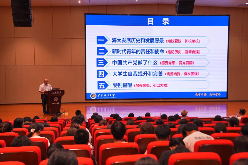 在报告会上,植秀成首先以“十看寒窗苦读,大学一朝解放”与“学习成就未来,知识改变命运”两个话题引导同学们思考“为什么要读大学”。然后通过图文并茂的形式从“海大发展历史和发展愿景”“新时代青年的责任和使命”“中国共产党做了什么”“大学生自我提升和完善”和“特别提醒”等五方面进行讲课,教育同学们做到知校爱校和护校荣校,强调同学们铭记历史和奋发图强,勉励同学们要利用大学完善自我和提升自己,希望同学们要感受党恩和做到爱党爱国,并提醒同学们加强网络安全警惕和做到文明用网。