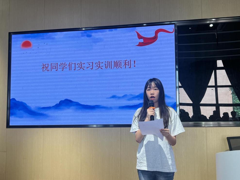 在实习动员会上,21级学生简菊慧代表学生发言,“走出校门的那一刻,我们便代表着海大的形象,因此我们要时刻铭记‘广学明德,海纳厚为’的校训,积极维护并展现我们海大人的良好形象和精神风貌”。并代表学生表决心“在实践中不断成长,迎接更大的挑战”。