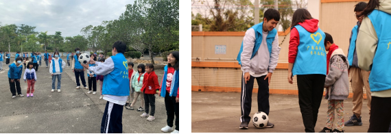 接下来便是户外小游戏环节,志愿者根据不同年级学生的特点,安排了不同的活动。低年级的小朋友一起玩老鹰抓小鸡游戏,高年级的小朋友组织了足球教学,包括理论教学与实践。