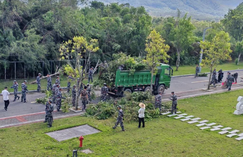 抗风救灾尽显学子担当。9月26日下午,台风“桦加沙”过境。风雨过后,校园里满是断枝落叶,部分器材也被吹得东倒西歪。5营学子集体参与校园清理活动:有人扛着扫帚在积水中清理落叶,裤脚湿透也顾不上拧;有人齐心协力搬开被吹倒的器材和树木。这场清理行动,让“团结互助、主动作为”的精神在5营学子心中愈发深刻。