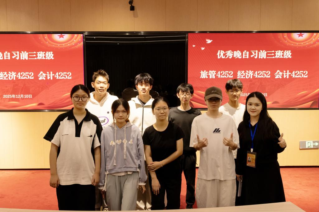 本次表彰活动紧扣晚自习建设成效,以多元荣誉为笔,勾勒新生勤学笃行的青春模样。其中,旅管4252、经济4252、会计4252三个班级凭借严谨的组织管理与浓厚的学习氛围,斩获优秀晚自习前三班级殊荣;旅管4251、经济4251、会计4251、工商4251、工商4252等班级,因推动班级晚自习建设稳步进阶、成效显著,斩获晚自习进步奖。此外,经民主推举脱颖而出的8名优秀晚自习学生——经济4251李林达、经济4252唐婉甜、会计4251王诗涵、会计4252袁欣、工商4251谢方宇、工商4252肖紫谊、旅管4251刘欣阅、旅管4252杨晓君,凭借专注自律的学习态度斩获专项奖品及奖励。前程似锦,灯暖如初。学风建设的暖意浸润每一位新生学子,让这份鼓励传递至每一位2025级学子心间。