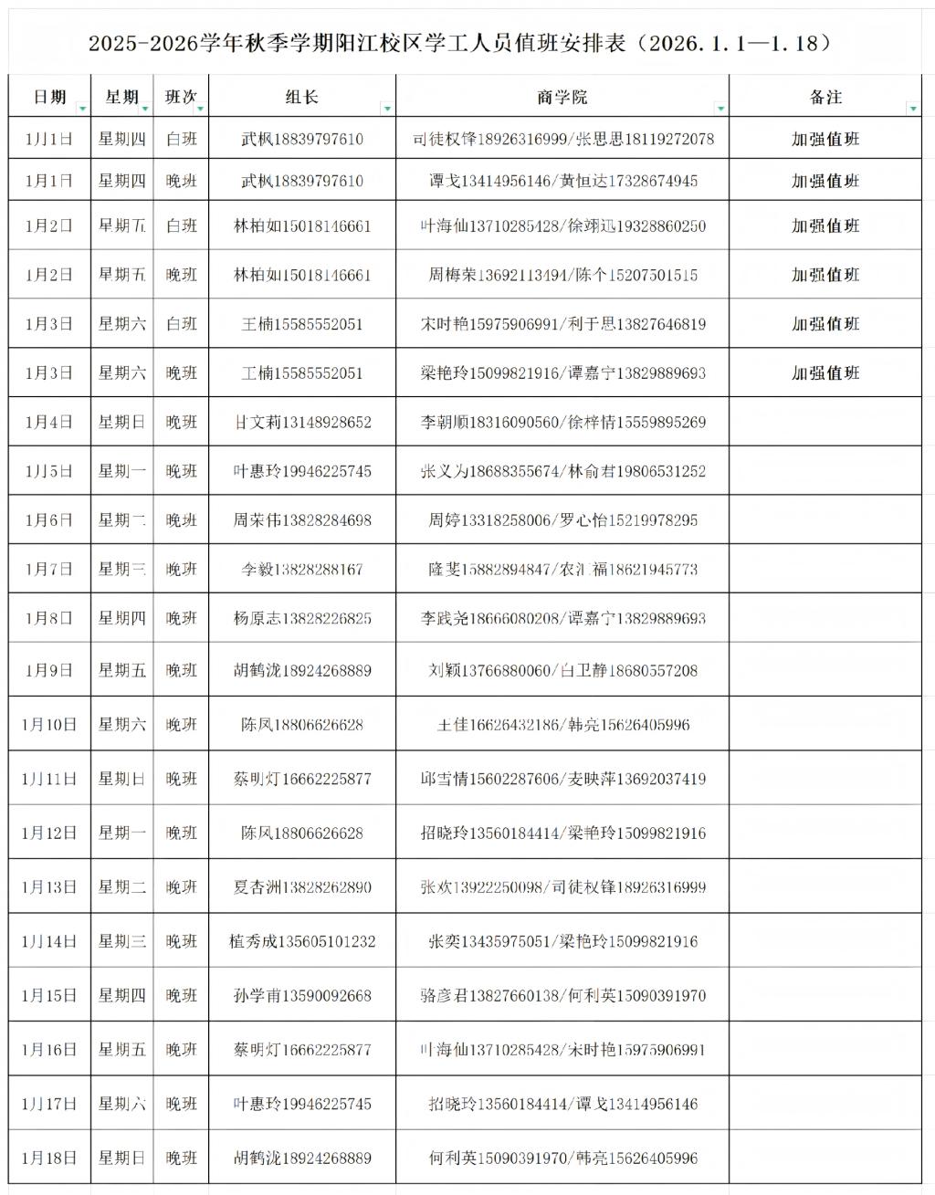 商学院辅导员班主任2026年1月值班安排表