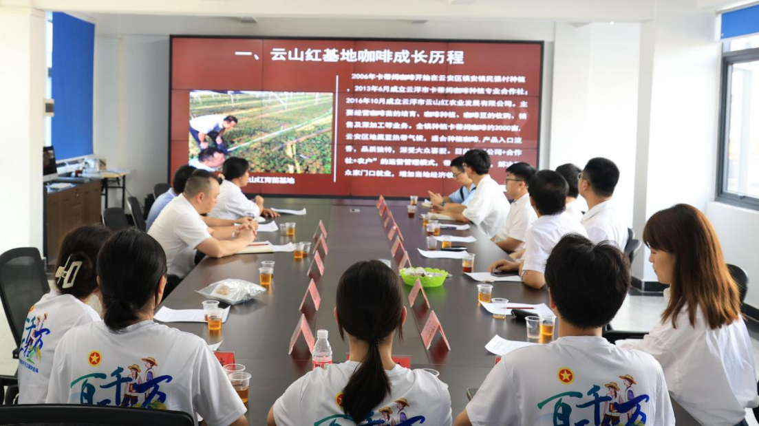 调研组来到云浮市云山红农业发展有限公司,在公司负责人梁玉华的陪同下,深入咖啡苗圃场实地察看了咖啡树的生长现状、种植管理以及病虫害防治情况,随后参观云安区人才驿站并举行交流会。
