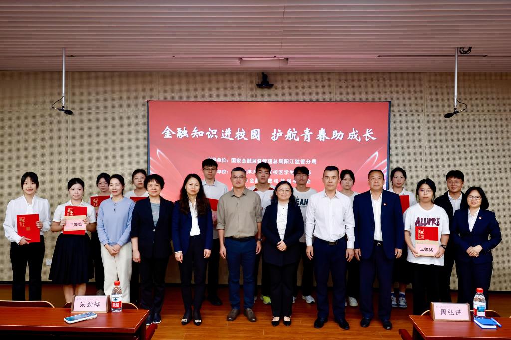 本次活动分颁奖与宣讲两个环节。在颁奖环节,主要是对参与2025年高校金融知识视频征集活动的获奖者予以颁奖。该活动由阳江校区学生事务部联合阳江市金融消费权益保护协会、中国银行阳江分行共同主办,自启动以来得到了校区学子的积极响应,征集到一批主题鲜明、形式新颖、富有教育意义的金融知识科普视频。周弘进、陈海燕、孙学甫、梁杏花等嘉宾为获奖学生代表颁奖。