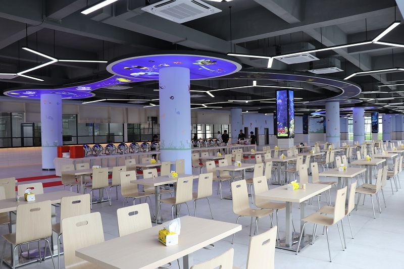 桃李食苑共两层,建筑面积约3700平方米。室内装修风格采用海洋元素作为主题,明亮大气,干净整洁,设备齐全。配置了1100多个用餐位,可以满足2500师生的用餐需求。开学后,食堂的供餐方式以自选餐为主,设置大众窗口、特色风味窗口、点心面食窗口、特色水吧等。同时,也将根据需要提供自助餐服务。