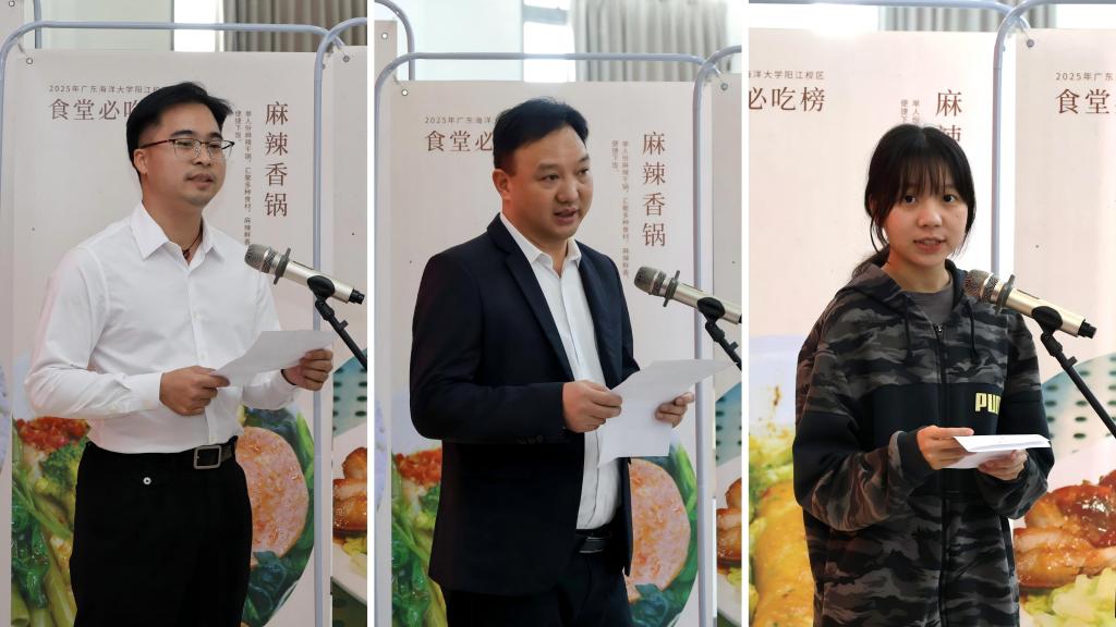 在“食堂必吃榜”揭榜环节,现场发布了最受师生欢迎的十佳菜品视频。麦冬宁为获奖食堂代表颁发牌匾,嘉禾食苑经理林华凯与桃李食苑经理丘胜伟分别发言,表达了对师生支持的感谢与持续提升餐饮服务的决心。