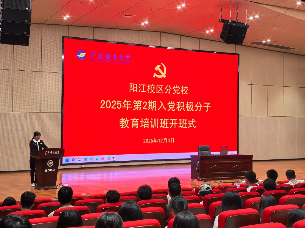12月3日下午,阳江校区党委分党校在海纳楼113报告厅举行2025年第2期入党积极分子培训班开班式。校区党委副书记丁永成作开班动员暨学习贯彻党的二十届四中全会精神宣讲,校区党委委员、管理办公室副主任、组织人事部部长刘波主持开班式,各学院专兼职组织员及120名入党积极分子参加。